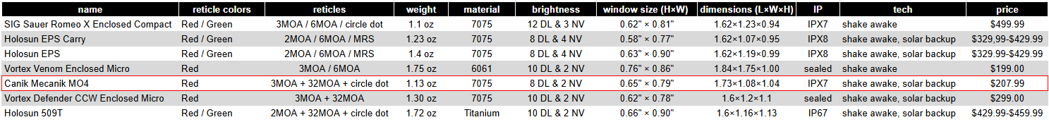 The Canik Mecanik MO4 has one of the most compelling feature sets seen in an enclosed micro red dot. Its window is bigger than the Holosun EPS Carry, which adds a bit of height, but not enough to be a deal-breaker. It’s also the lightest option you can find among enclosed micro pistol sights.